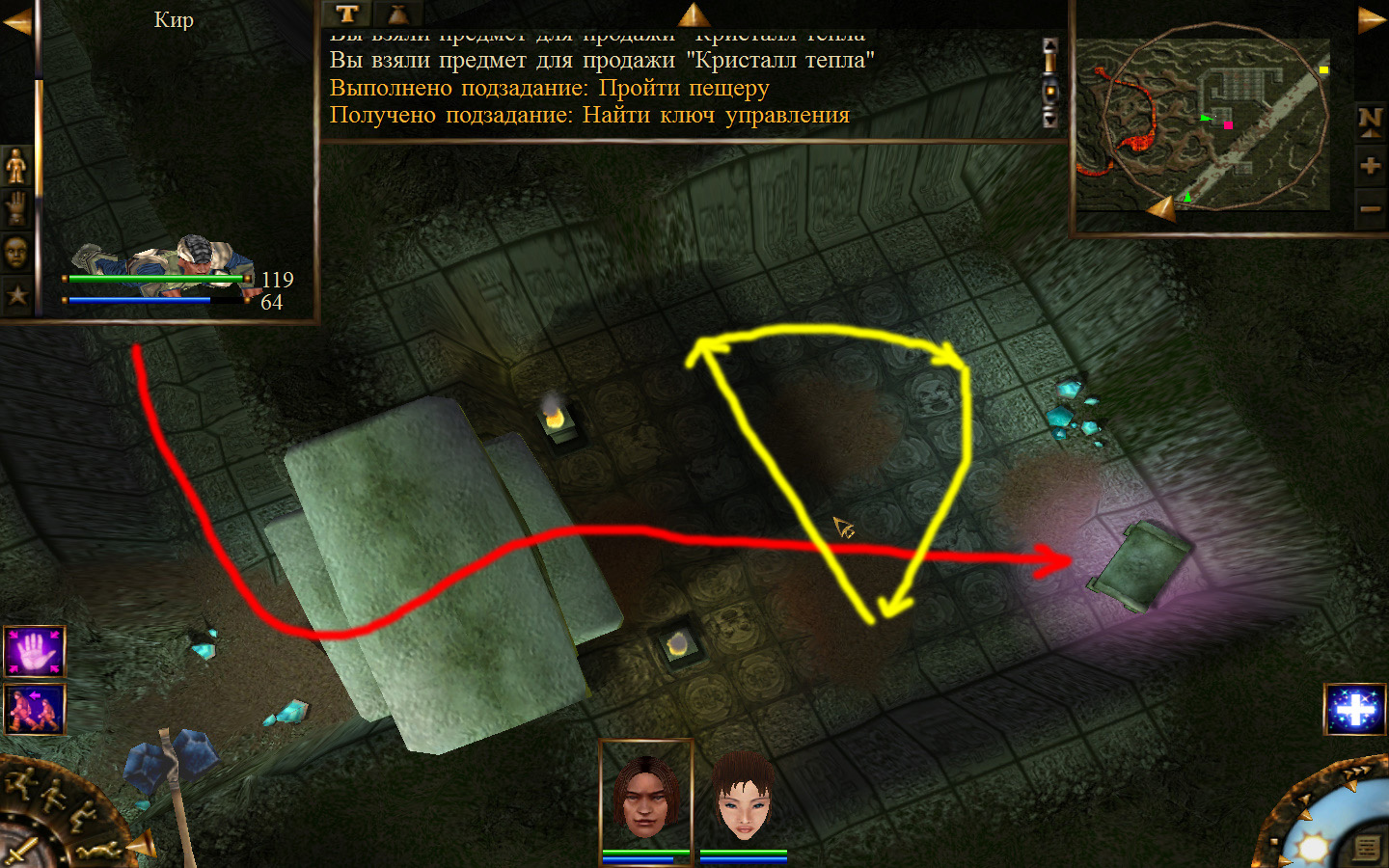 Там необходимо проползти до пирамидки, подсвеченной розовым и отключить ее. По комнате ходят големы в довольно-таки хаотичном порядке, проползаем между ними (големами) и доползаем до пирамидки, как показано на изображении. Вокруг пирамиды установлена ловушка. Когда ловушка подействует, то есть пройдут все огненные взрывы, нужно активировать пирамидку и идти обратно к Кель. Там, напротив выхода из пещеры в главный проход, будет дверь, нужно проползти ровно между големами-охранниками и открыть дверь, установить фигурку на алтарь. После этого все големы станут дружественными и остается только дойти до противоположной стороны главного прохода. Когда выйдете к озеру, нужно будет дойти до входа к магу вот и все. Поговорив с магом, мы отправимся на Ингос, но не сразу, а после того, как скажем магу, что мы готовы. Но мы не готовы еще, необходимо выполнить дополнительные миссии и открыть все сундуки. Я это сделаю, а вы сможете узнать о том, где найти все сундуки и как выполнить секретные миссии из дополнительных статей.
