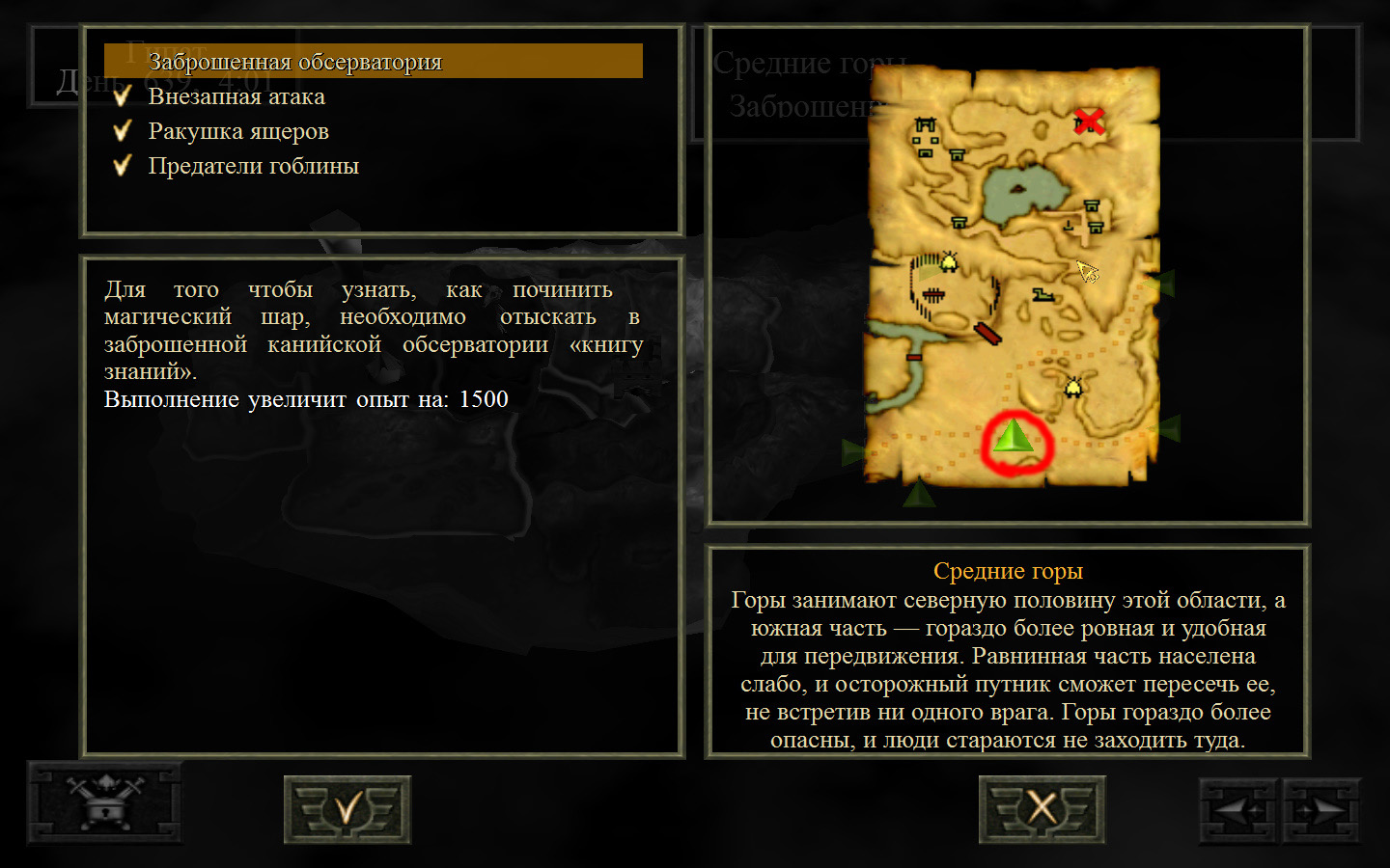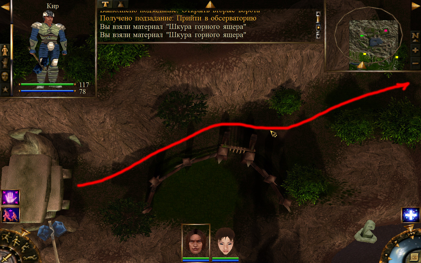 Выходим в локацию Средние горы в точке, указанной на изображении. Появляемся рядом с шахтой Бабура. Далее необходимо отправиться к алтарю ящеров, где ранее необходимо было украсть ракушку. Там будет ущелье, проходим через него и, дойдя до ворот, открываем их. На пути будут сначала встречаться лесные ящеры и один тролль, а за воротами будут горные ящеры. С горными ящерами лучше разбираться по одному. После прохождения первых ворот идем по ущелью до вторых, их тоже открываем при помощи ключа. Дальше идем прямо, убивая незначительных по силе врагов. Дойдя до обсерватории необходимо будет убить гарпий и забрать книжку из сундука. Все идем к Знахарке.