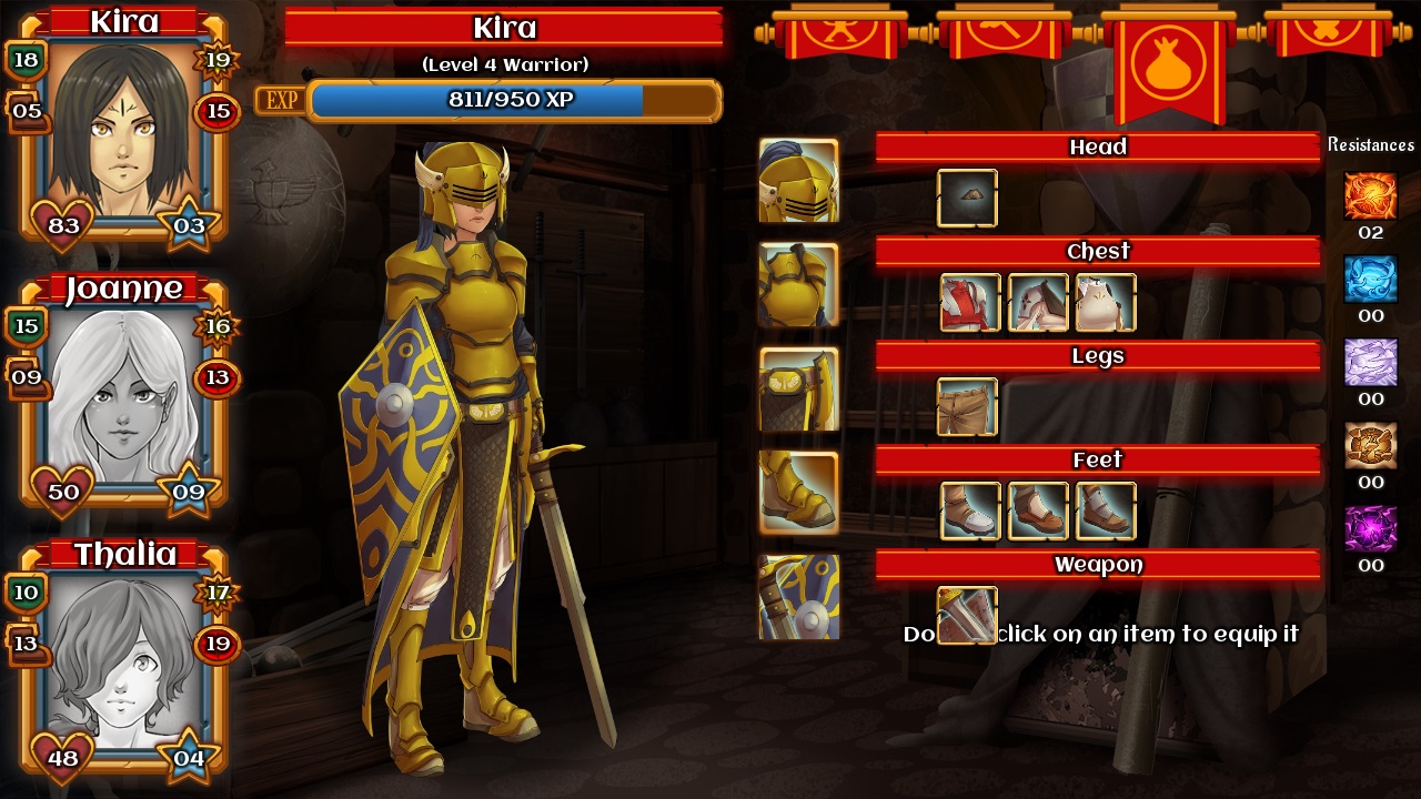 Странный аспект игры, потому что на самом деле он напрочь отсутствует. В игре нет нормального оружия, кроме стартового и финального, которое обгоняет всё остальное по всем параметрам. По идее у героев в соответствующих лавках есть своё оружие по пять штук на каждого, но они фактически бесполезны на старте. Только где-то в середине игры стоит заменить Талии кинжалы на арбалет потому что он повышает шанс критической атаки и является дальнобойной атакой, на которую не работает контратака, а Кире набор Juggernaut, потому что он повышает HP. В финале вам выдадут оружие, которое является наилучшим для каждого.