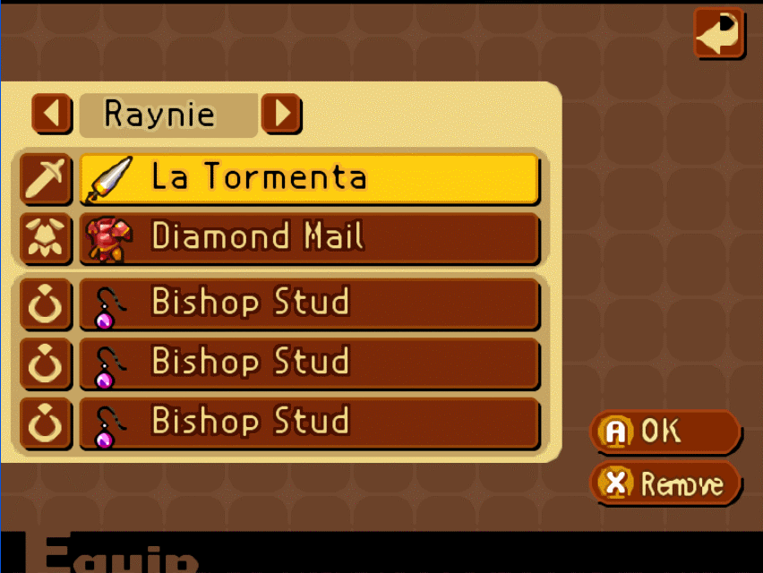 Перейдём к экипировке персонажа. Здесь всё достаточно просто: мы можем экипировать оружие, броню и 3 аксессуара на героя. Хочется отметить, что в игре решает не столько экипировка, сколько ровные руки и умение пользоваться преимуществами боевой системы, поэтому не переживайте сильно, если ваши вещи слишком долго уже на вас надеты, а в магазине есть кое-что получше зачастую обновление снаряжения не критично, можно некоторое время и обойтись. Хотя, честно говоря, если умело пользоваться этой системой бонусов после боя, то деньги никогда для вас проблемой не будут.