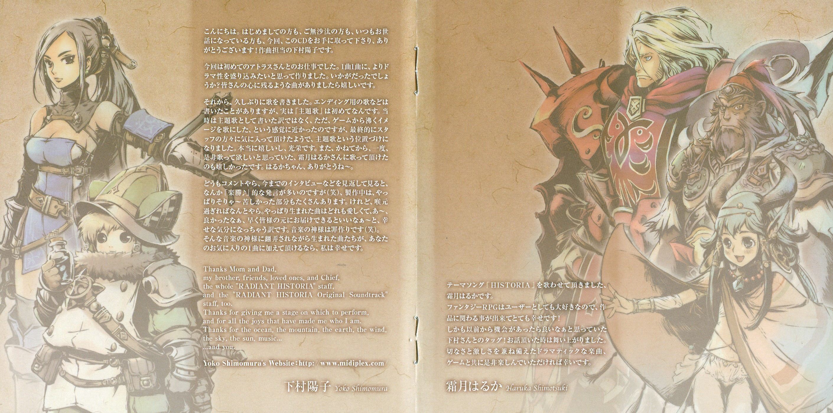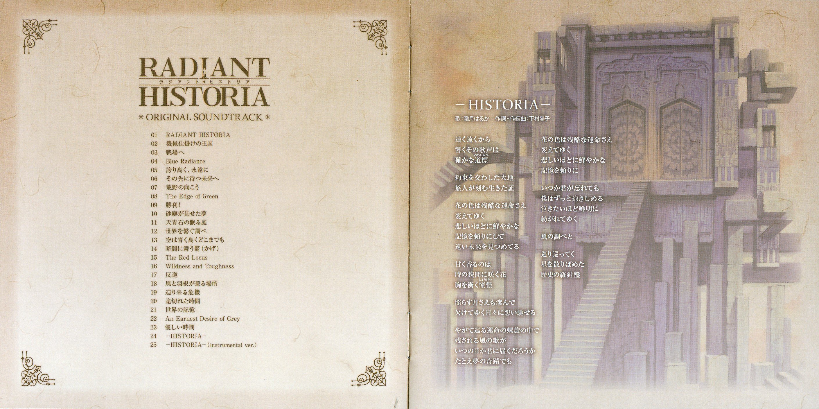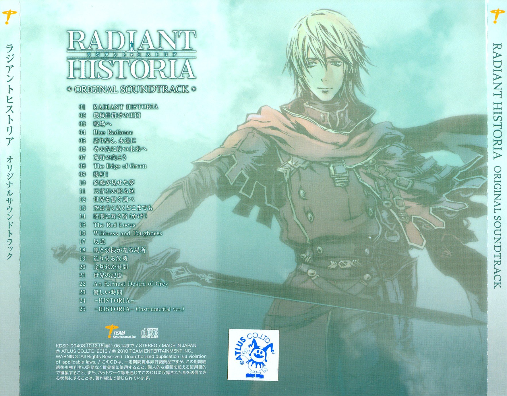 № Название Длительность английский японский 1. RADIANT HISTORIA «RADIANT HISTORIA» 3:26 2. The Machinist Kingdom «機械仕掛けの王国» 3:10 3. To the Battlefield «戦場へ» 1:43 4. Blue Radiance «Blue Radiance» 4:09 5. Forever Proud «誇り高く、永遠に» 3:47 6. To the Future that Awaits Ahead «その先に待つ未来へ» 2:40 7. Beyond the Wilderness «荒野の向こう» 3:15 8. The Edge of Green «The Edge of Green» 3:14 9. Victory! «勝利!» 0:47 10. Dreams Showed by a Cloud of Dust «砂塵が見せた夢» 2:36 11. The Garden Where the Celestite Lies «天青石の眠る庭» 2:59 12. The Melody Connecting the World «世界を繋ぐ調べ» 1:47 13. Unending Clear Blue Sky «空は青く高くどこまでも» 3:06 14. Shadows Dance in the Darkness «暗闇に舞う翳(かげ)» 4:14 15. The Red Locus «The Red Locus» 3:34 16. Wildness and Toughness «Wildness and Toughness» 3:35 17. Rebellion «反逆» 1:45 18. A Place Where Wind and Feather Return «風と羽根が還る場所» 2:22 19. Impending Crisis «迫り来る危機» 1:05 20. Interrupted Moment «途切れた時間» 1:45 21. Memories of the World «世界の記憶» 3:07 22. An Earnest Desire of Grey «An Earnest Desire of Grey» 4:25 23. Affectionate Moment «優しい時間» 3:14 24. -HISTORIA- «-HISTORIA-» 4:29 25. -HISTORIA- (instrumental ver.) «-HISTORIA- (instrumental ver.)» 4:26 Общая длительность 74:40