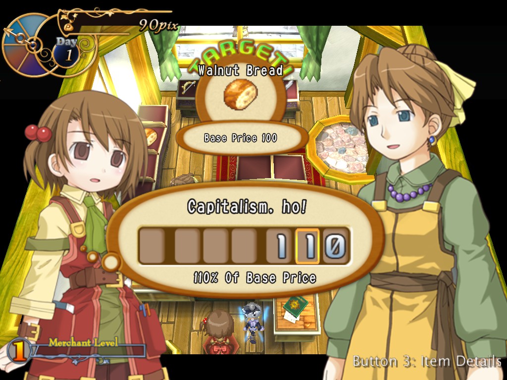 Но постепенно игра из какого-то чудесно-магического приключения превращается в ужаснейшую тягомотину. В первой половине дня скупить всё лучшее доступное оружие у кузнеца, закупить побольше удешевлённого товара, чтобы затем его перепродать, потом сбегать к другой продавщице, вспомнить все особые заказы на несколько дней вперёд, вернуться домой, расставить выкупленное барахло и начать торговать под крайне психоделичные восклицания Ресетты и уже не радуясь фразочкам вроде Capitalism, ho!