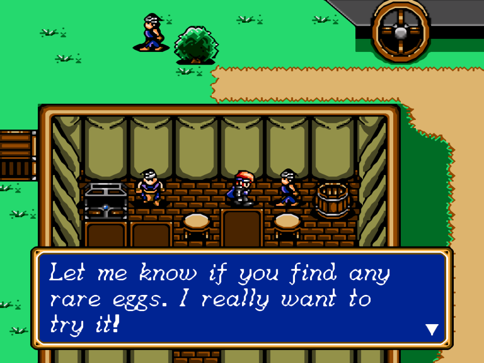 Использовать яйцо нужно в городе-караване Пао, уже после сражения с Эллиотом. В вагоне с торговцем предметами стоит еще одни человек владеющий аппаратом для высиживания яиц. Согласитесь на его предложение, и тогда вместо яйца появится Доминго и автоматически присоединиться к команде. |