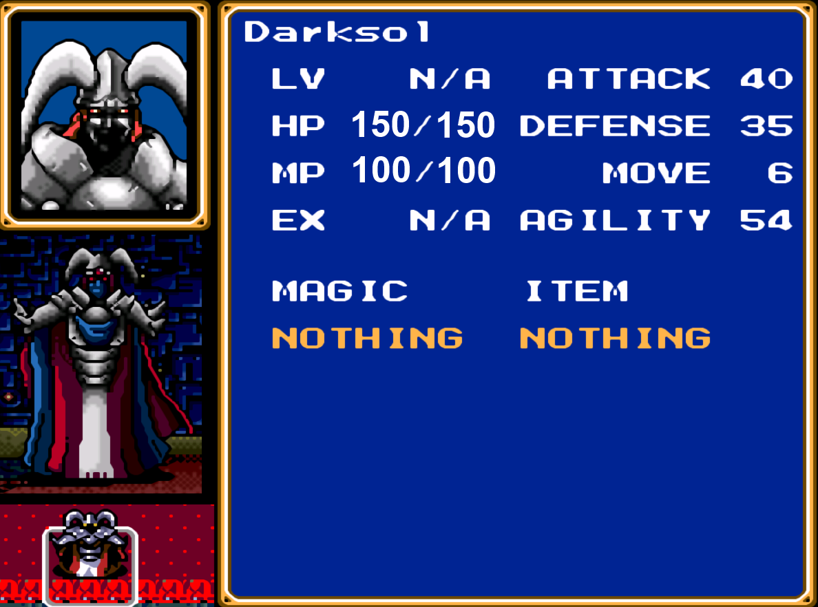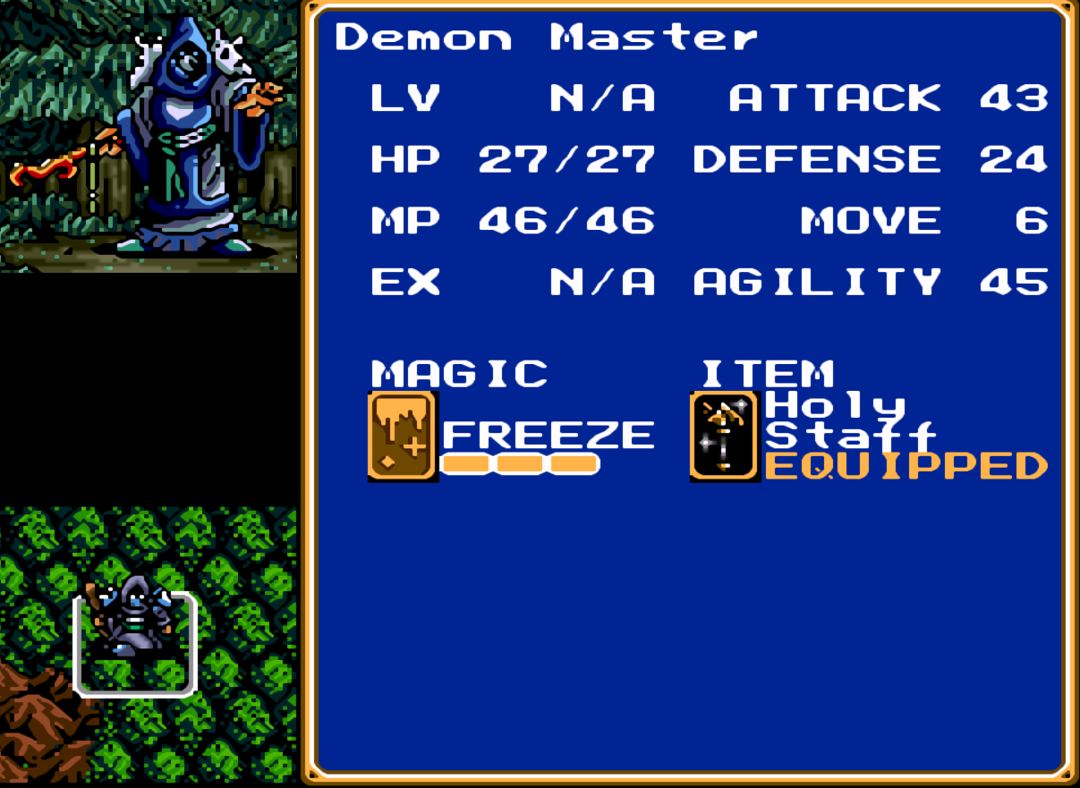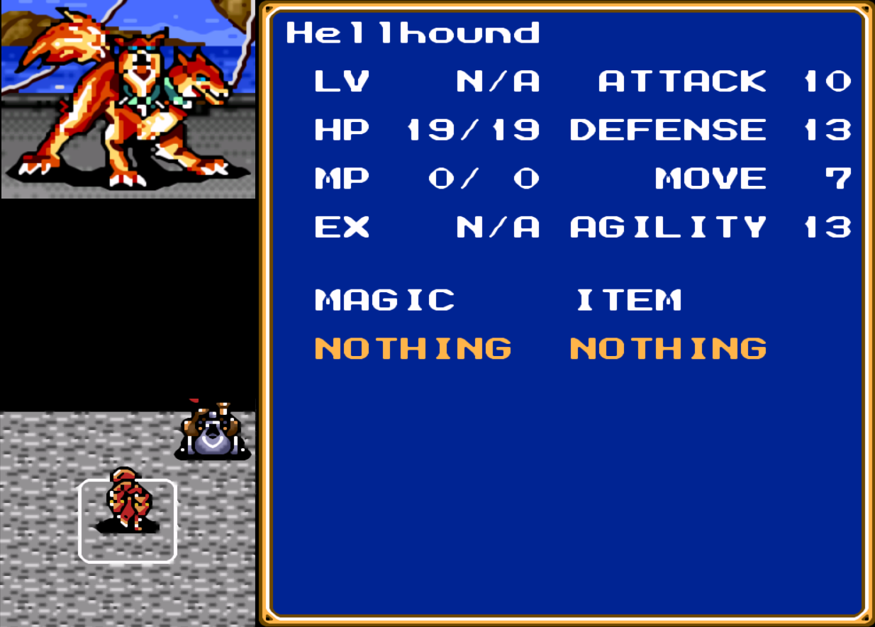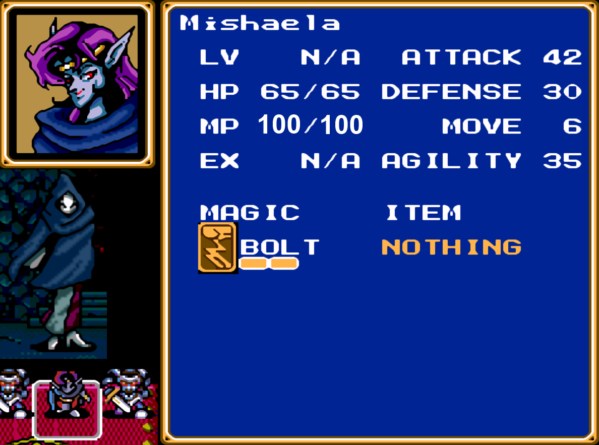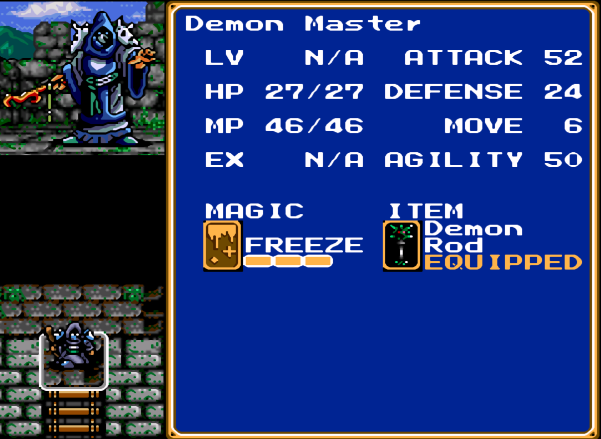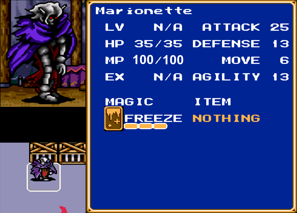 - Особая атака — «Демоническое пламя Lv.2». Дистанционная атака на расстояние 1-3 кл. по площади в 13 кл., наносящая 25-32 НР урона, игнорируя защиту цели