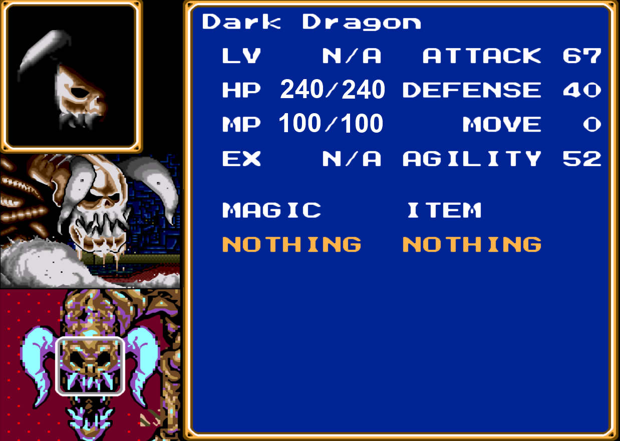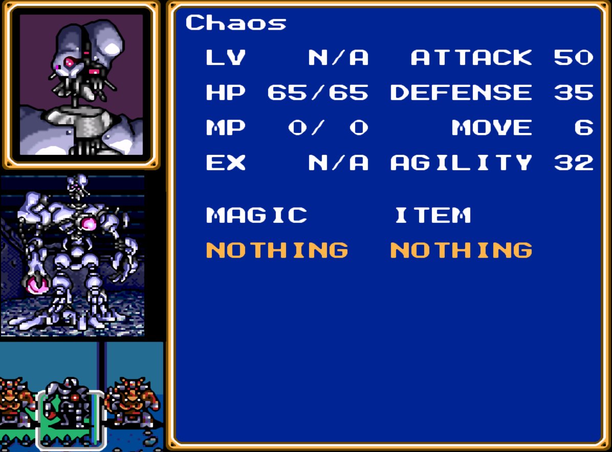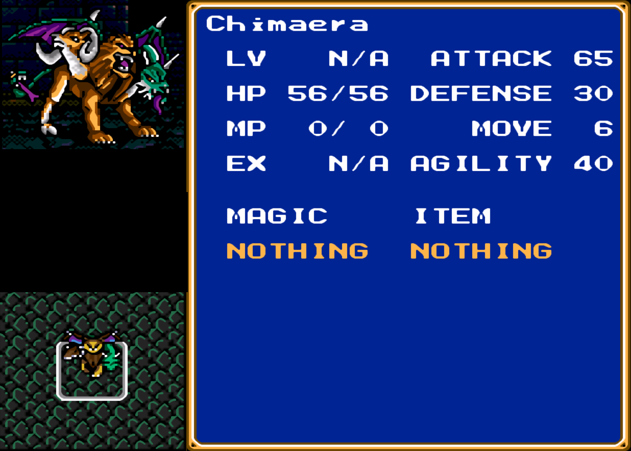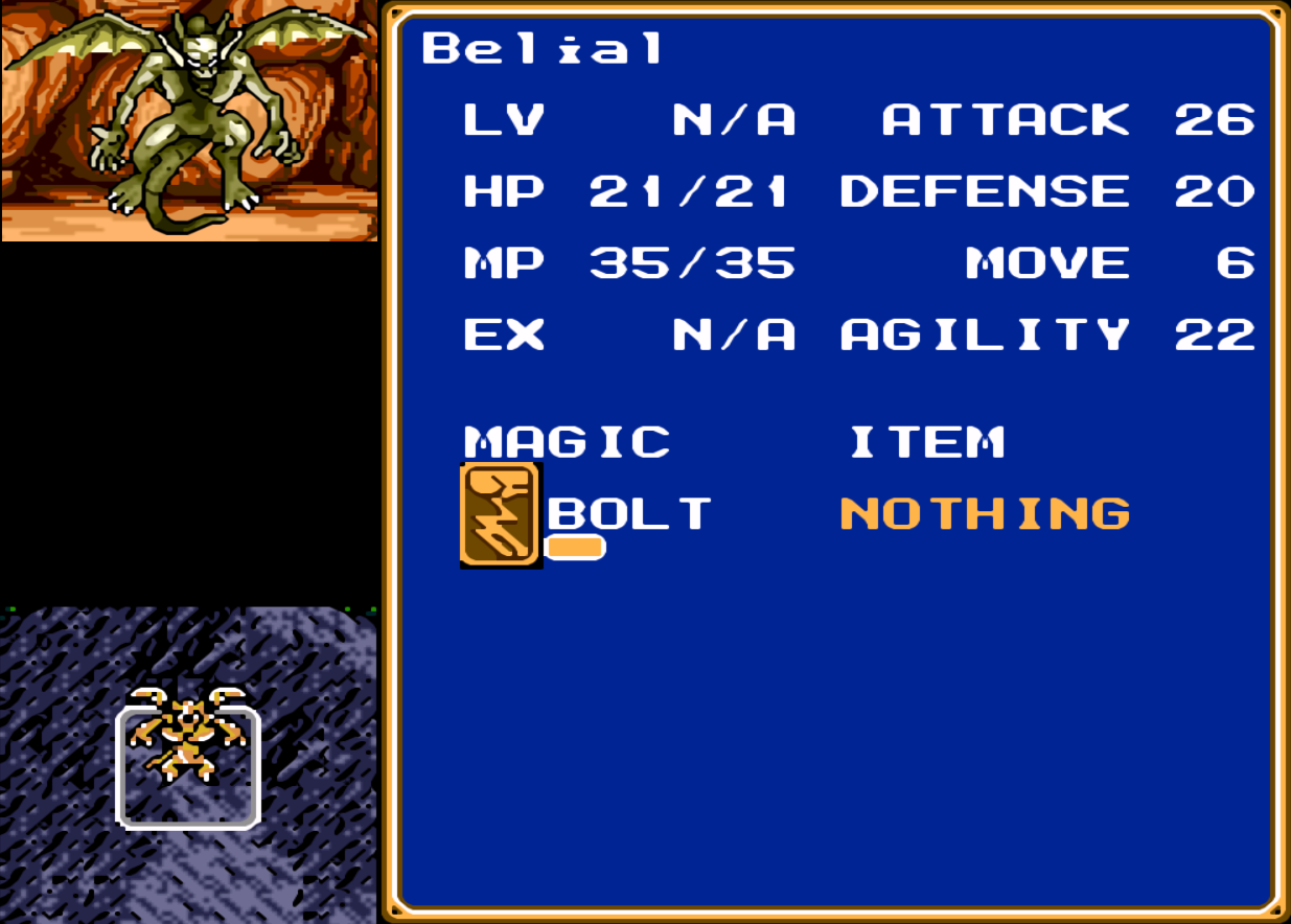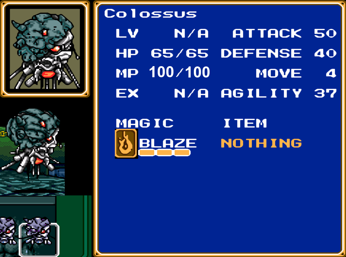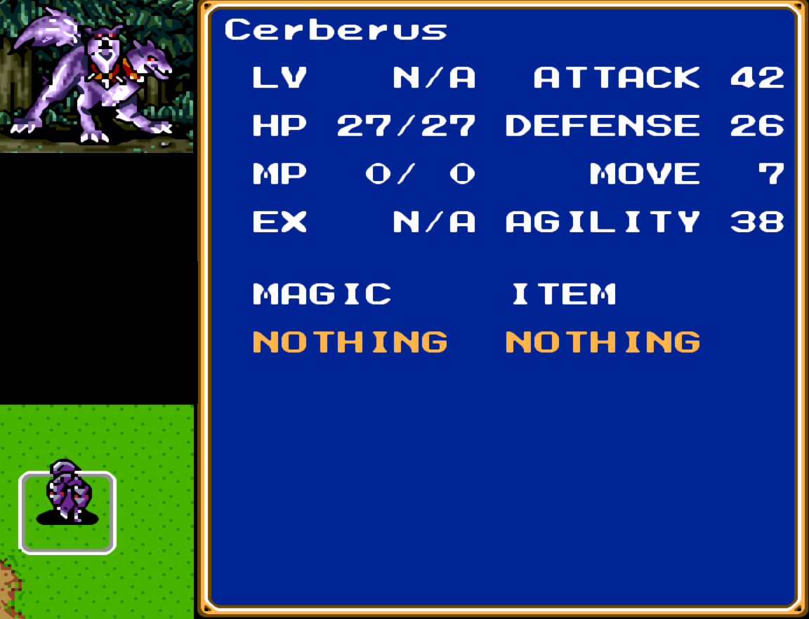 - Особая атака — «Демоническое пламя Lv.2». Дистанционная атака на расстояние 1-3 кл. по площади в 13 кл., наносящая 25-32 НР урона, игнорируя защиту цели