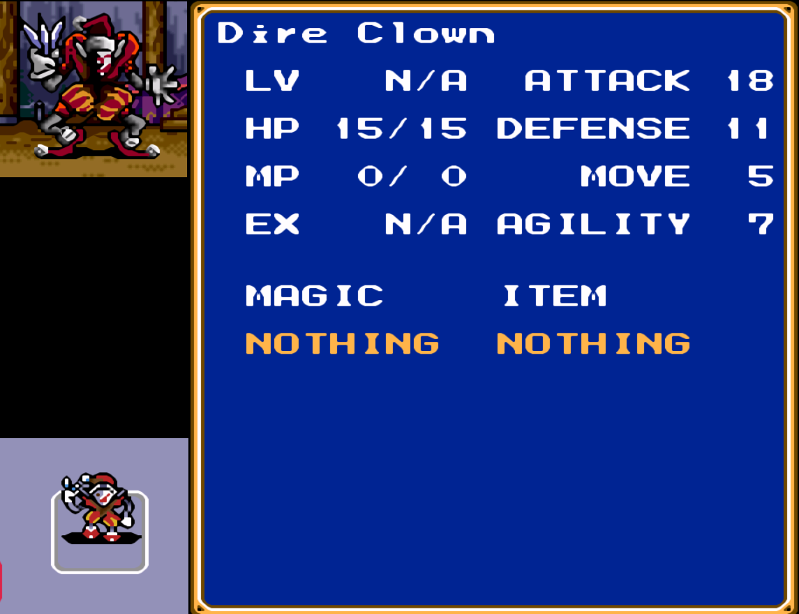- Особая атака — «Демоническое пламя Lv.1». Дистанционная атака на расстояние 1-3 кл. по площади в 5 кл., наносящая 25-30 НР урона, игнорируя защиту цели