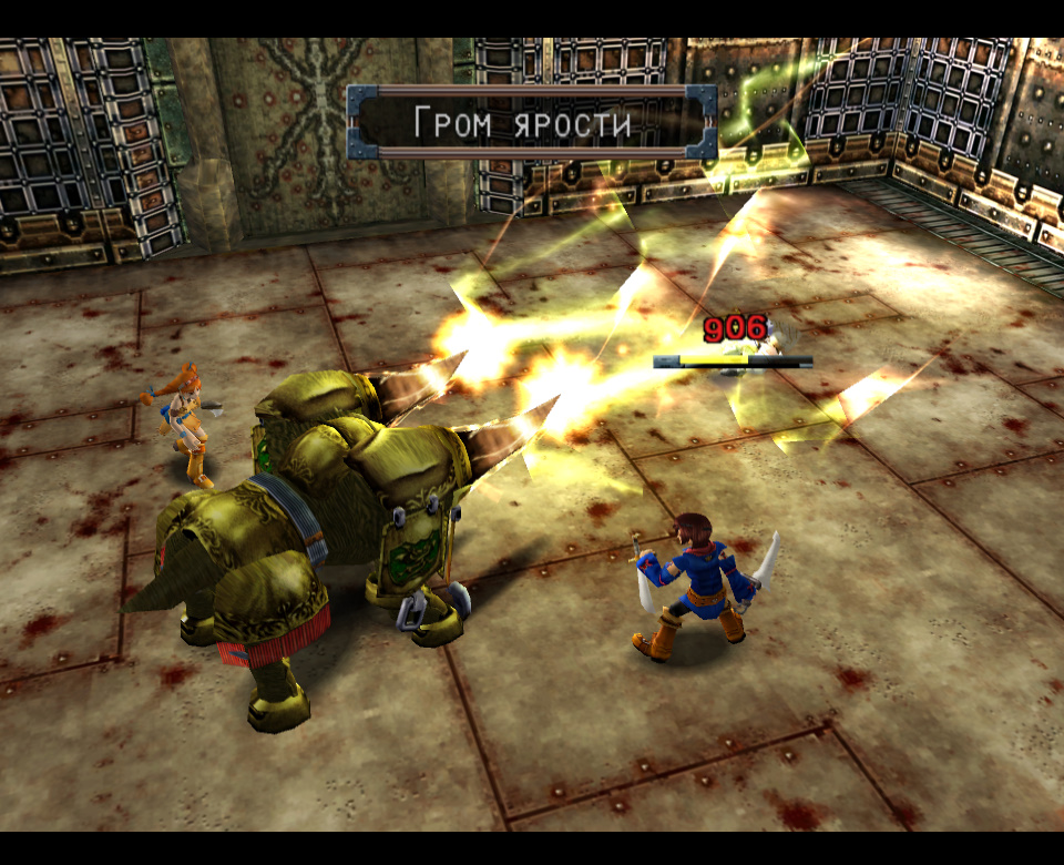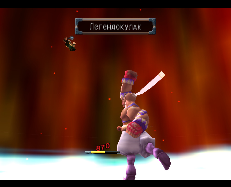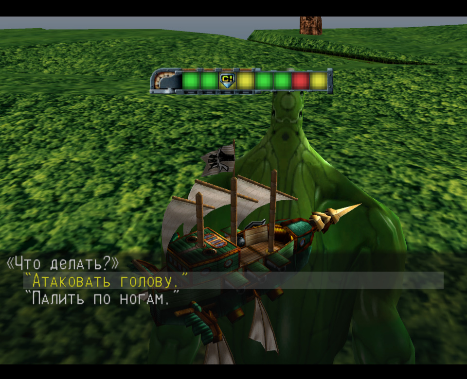 В отличии от Рекумена его урон невелик, в районе 2000-4000, но бить он будем много. Очень много. А если ещё вы выберите бить по ногам, то бить он будет гораздо больнее. Лучше атаковать голову! Сначала копим SP на максимум и поддерживаем здоровье. Затем стреляем по C! ячейкам и из Гарпунной пушки, но старайтесь всегда поддерживать SP выше 20. Как только снесёте 80-90% его здоровья, он начнёт странно себя вести и хвататься за голову. В этот момент в первом-втором раунде у вас будет один-два шанса на использование Гарпунной пушки. Драхма скажет вам когда. Тогда вы скинете босса прямо в реку. Это будет считаться победой. Его можно победить и грубой силой, но это никак не повлияет на награду. |