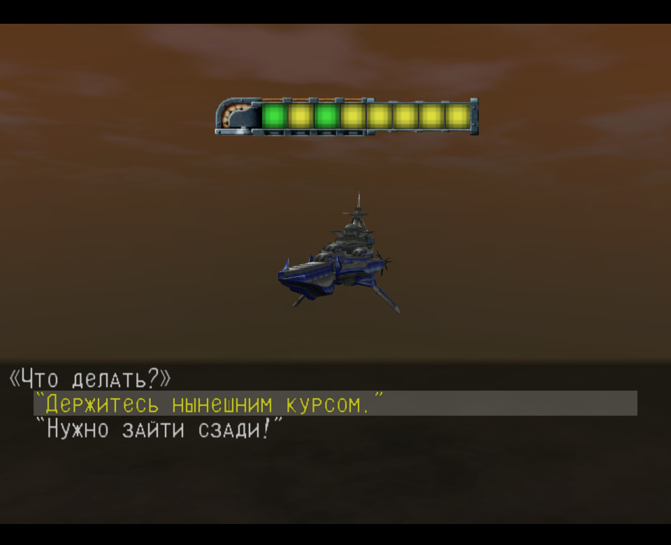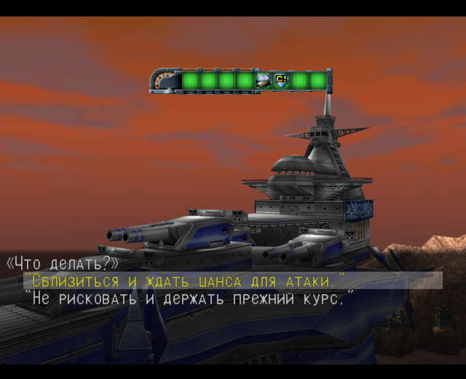 Ещё одно корыто. Копим SP в первых двух раундах. Когда появится выбор, выбираем. Что делать? Close in and look for an opening/Подойти и ждать шанса для атаки. Don’t risk and keep in course/Не рисковать и сохранять курс. В следующем раунде стреляем из Супер орудия. Пока кораблик. |