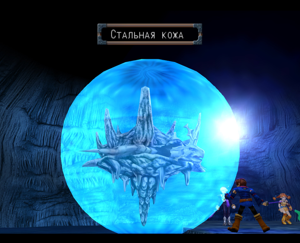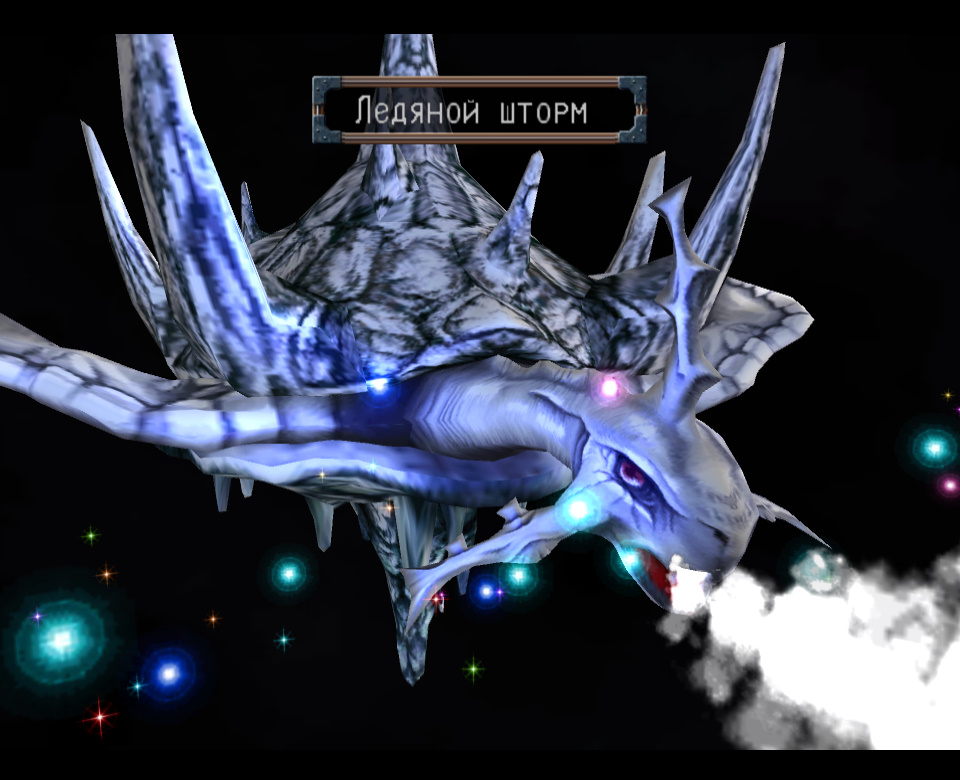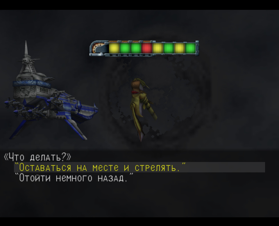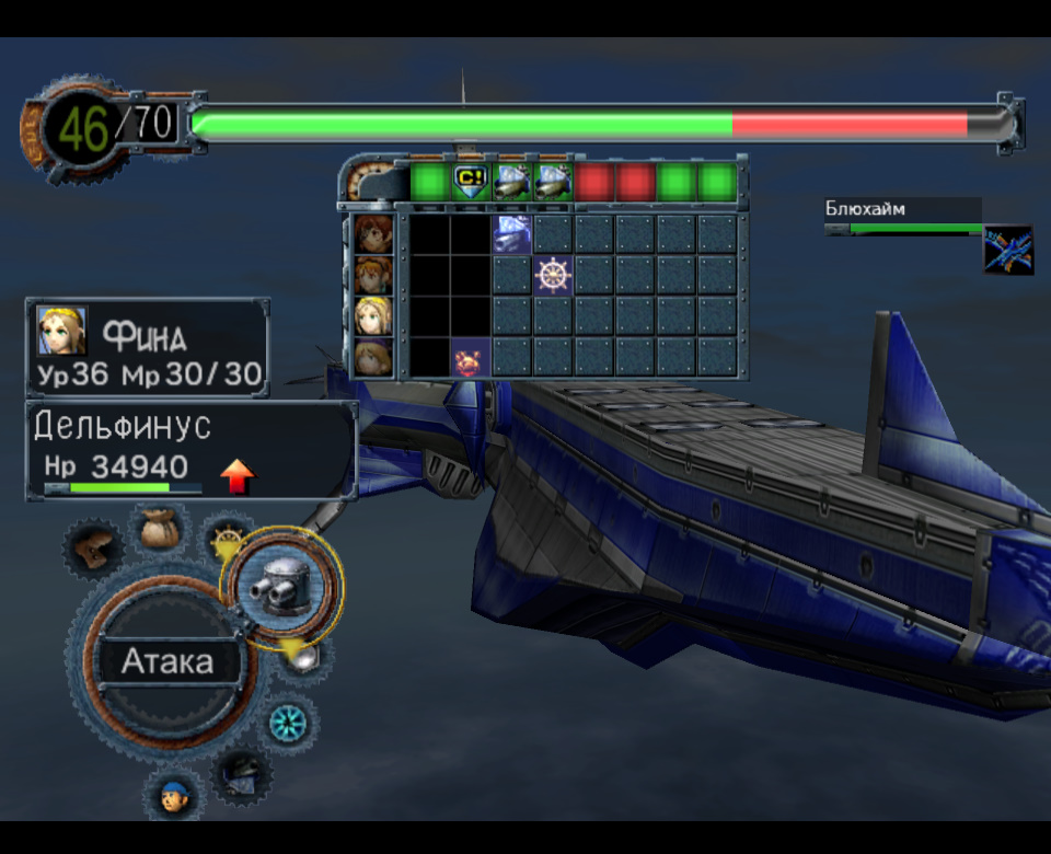 Крепкий, но его атака слабая. Уязвим к красной и особенно синей магии. Сначала, в первые три раунда, постоянно копим SP, используя фокус и Марко. Терпим его атаки, лениво постреливая из основного орудия и магией. На третьем ставим Усиление. Если серьезно ранят, включите Пинту (он заблокирует урон членистоногого) и подлечитесь. Что делать? Maintain present course/Сохранить курс. Try to get behind him instead/Нужно зайти сзади! Как только предстанет выбор, выбираем «Maintain present course./Сохранить курс». Тогда откроется доступ к Пушке Лунного камня в третьем, четвертом и в пятом раунде. Стреляем из всех стволов и уничтожаем кальмарку. |