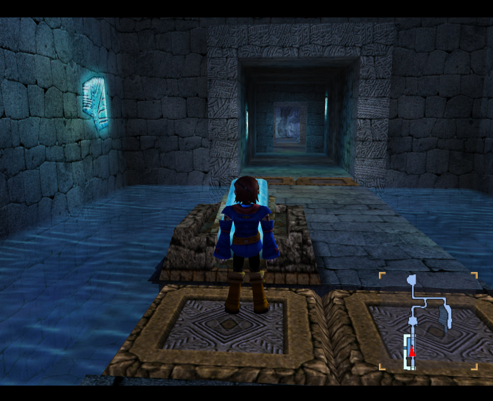 2) Начинаем осматривать комнаты по часовой стрелке, начинаем с западной (смотрим на мини-карту). Окажетесь в комнате, где много маленьких бассейнов. Пройдите вперёд, мимо двух перекрёстков, сверните налево на третьем и тут же спускаемся по склону в воду. Здесь нажимаем на переключатель, спускаемся по склону и выходим из этой комнаты и идём обратно в главную.