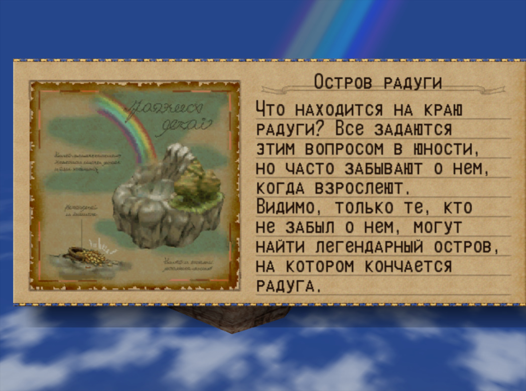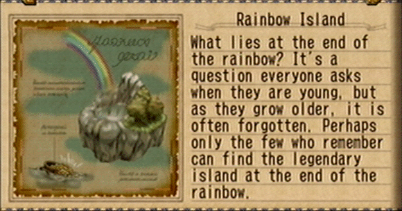 От острова Полумесяца летим строго вверх в Верхнее небо, летим на юг, и чуть на восток. Вы увидите радугу, в конце которой расположен невидимый остров. |