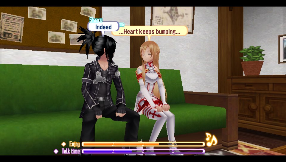 Во время разговора внизу видны две шкалы: верхняя обозначает удовольствие от разговора, нижняя время разговора. Чтобы повысить настроение девушки на один уровень, надо полностью заполнить верхнюю шкалу, пока не истекло время. Длина шкалы времени зависит от общей привязанности героини (affection в ее профиле в списке друзей). Увеличение удовольствия зависит от ваших ответов на ее реплики. Не пытайтесь понять, что говорит девушка и как с этим связаны ваши ответы – перевод в этот моменте у игры ужасен. В романтических местах просто жмите R, большинство хороших ответов будут на ней. Если от R ничего не прибавилось, то в следующий раз можете нажать на круг в ответ на ту же реплику. Повторить заполнение, пока ее настроение не получит пятый уровень: In Love.