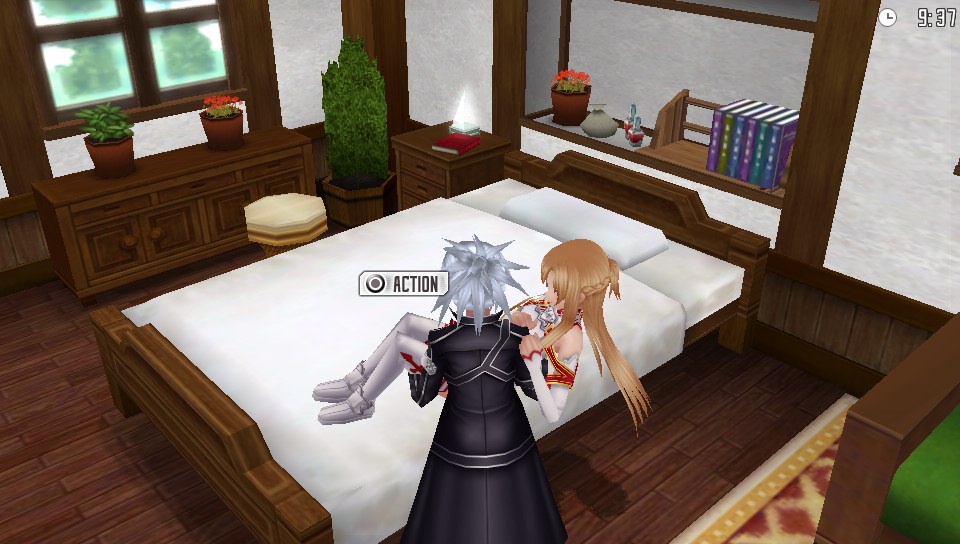 Затем ведите девушку в магазин Агила. Подводите к лестнице и берите ее на руки (Bridal carry), а затем в свою комнату. Не попадайтесь на глаза другим девушкам, когда берете ее на руки, иначе настроение сбросится до нейтрального и придется начинать с начала. Несите в комнате ее к кровати. Как только оба устроитесь на постели, она начнет новый диалог с двумя шкалами. Жмите так же R на все реплики, чтобы заполнить верхнюю шкалу. Если это вышло, то будет сцена в постели с соответствующей картинкой.