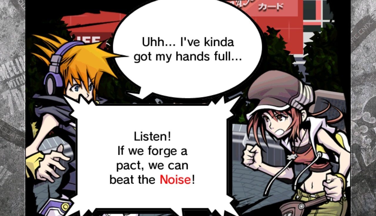 Молодой человек по имени Neku просыпается посреди многолюдного перекрёстка в центре города с готично выглядящим значком и полной пустотой, вместо воспоминаний (амнезия FTW!). Очень скоро он замечает, что значок позволяет ему читать чужие мысли, а город наводнили монстры, атакующие всех, кто их видит. Очень быстро он встречает Shiki девушку-гаджетофила с хорошим дизайнерским вкусом. Оба (несмотря на протесты Neku) должны заключить пакт (привет Persona, давно не виделись) чтобы иметь возможность как-то отбиваться от монстров оказывается, только группа из двух человек, заключивших между собой пакт, способна достойно бороться с агрессивной фауной. Со времем, оказывается, что те впутались в странную игру, где проигрыш равносилен смерти.