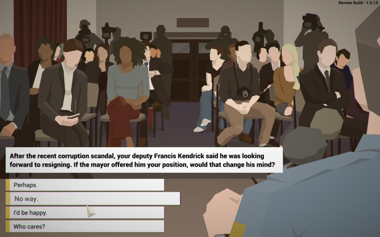 Репортеры будут задавать вам вопросы связанные с отставкой шефа и иные вопросы, а вы отвечаете так как вы считаете нужным, и между прочим каждый ответ влияет на дальнейшее продвижение, ссору с мэром или дружбу, войну с мафией или союз? А что репортеры? Им лишь бы настрочить в газету скандальную новость.