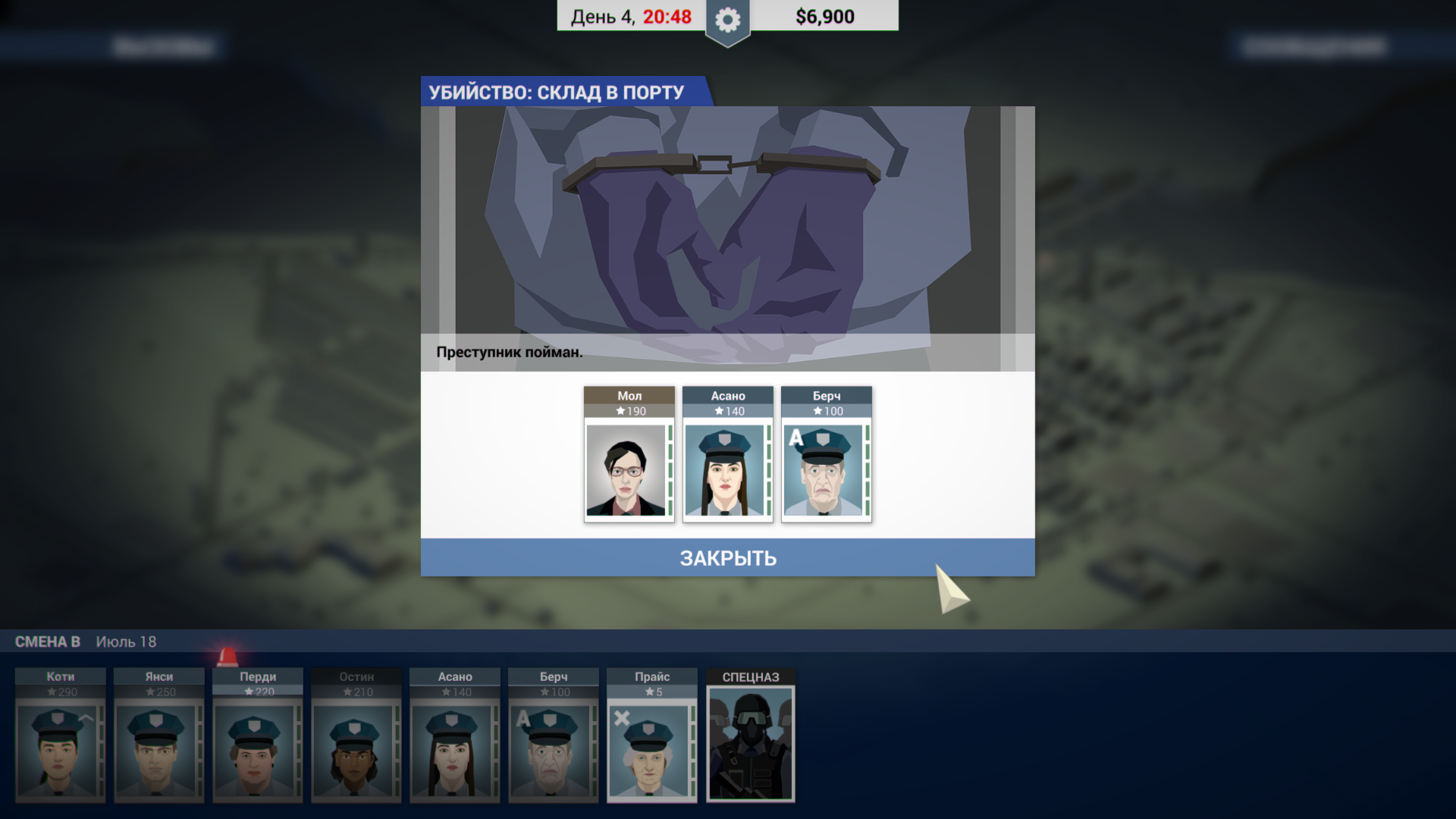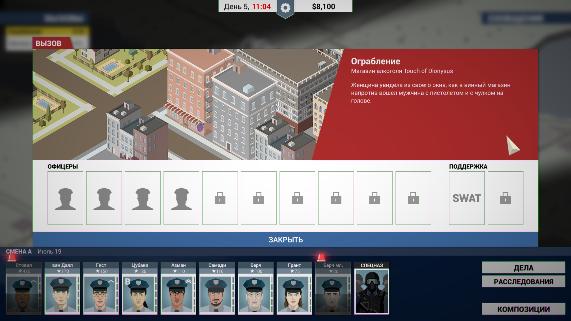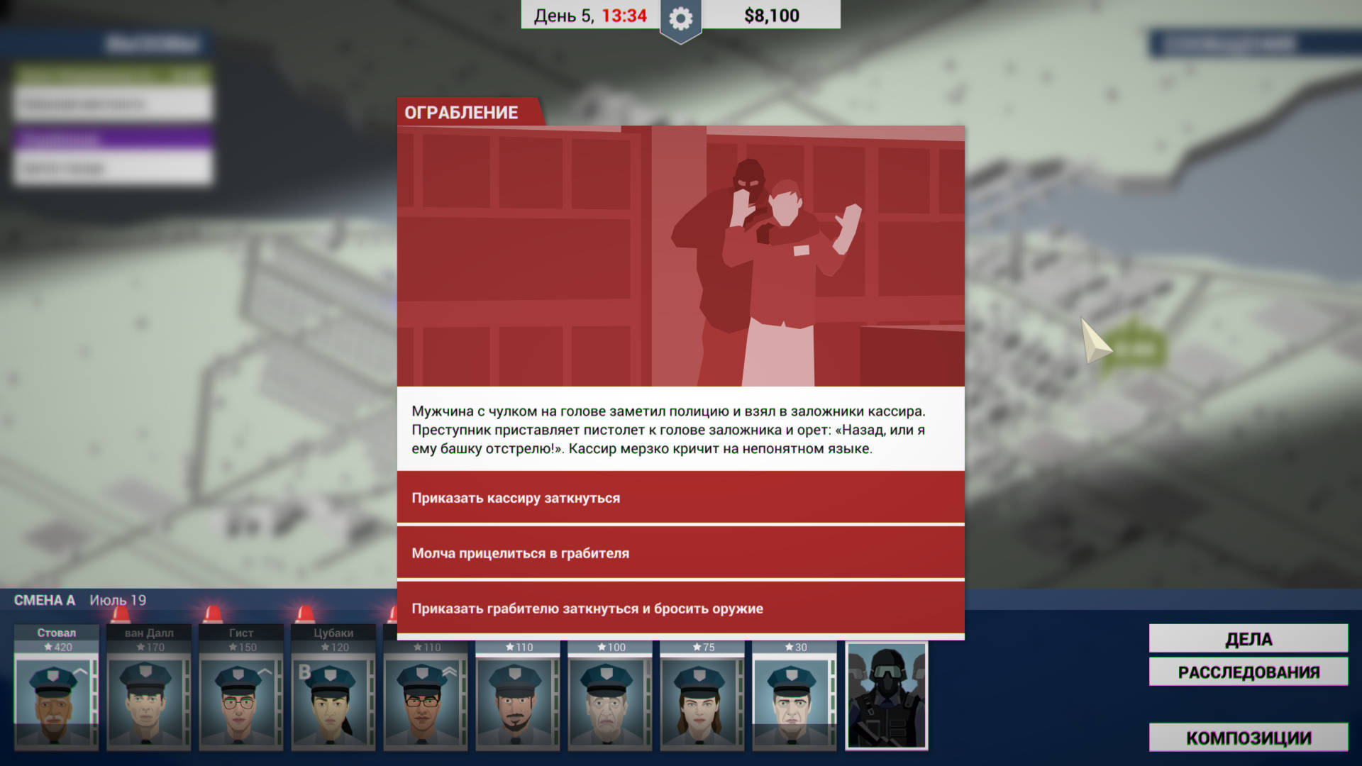 Потом дальше уже будет больше новых дел и сложнее, где еще больше думать и решать. Один из них расследование. Произошло серьезное дело, например, убийство. На это дело отправляем детектива, только проследи чтобы они у вас в штате были. Детективы приезжают и начинают расследование: опрашивают свидетелей, ищут улики и остальное, только вот успех будет зависеть от опыта детектива, чем ниже, тем больше пропустят улик, также состава, если не одного, а несколько, тем лучше сработают. Только опять у вас ограниченный штат.