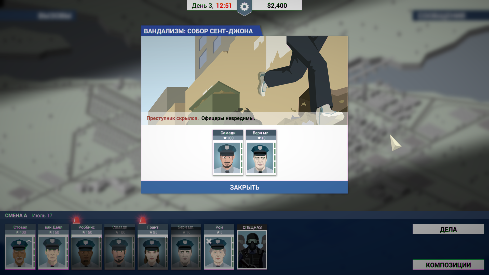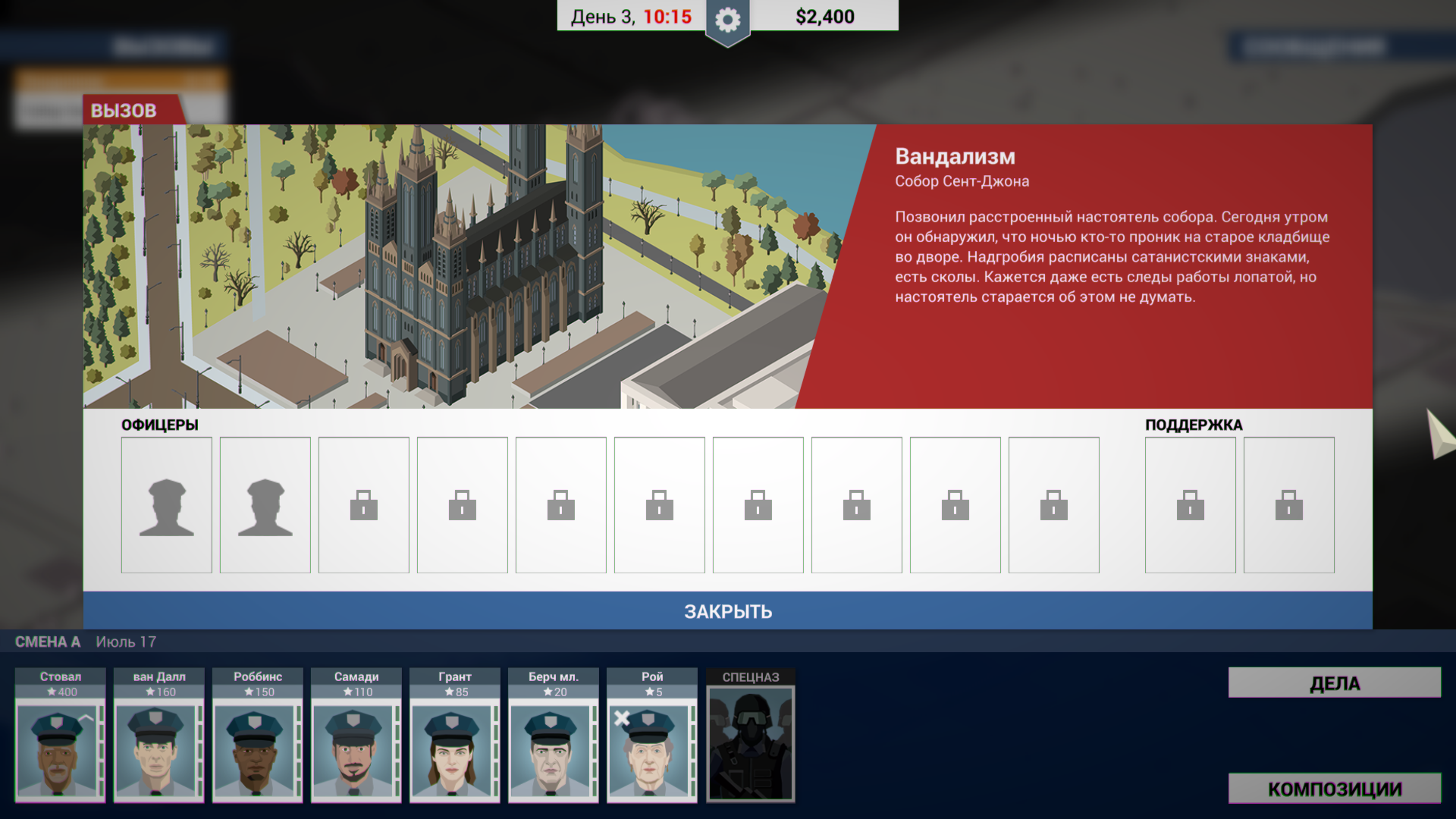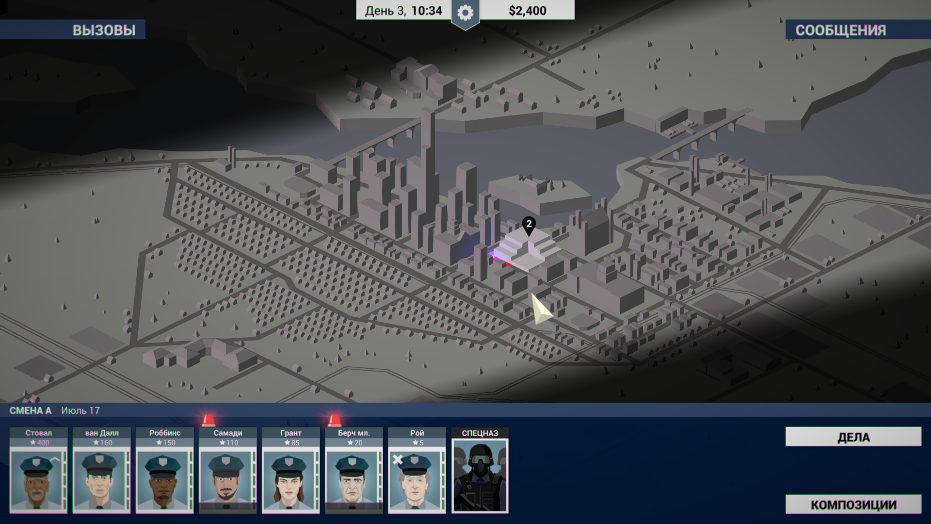 Потом дальше уже будет больше новых дел и сложнее, где еще больше думать и решать. Один из них расследование. Произошло серьезное дело, например, убийство. На это дело отправляем детектива, только проследи чтобы они у вас в штате были. Детективы приезжают и начинают расследование: опрашивают свидетелей, ищут улики и остальное, только вот успех будет зависеть от опыта детектива, чем ниже, тем больше пропустят улик, также состава, если не одного, а несколько, тем лучше сработают. Только опять у вас ограниченный штат.