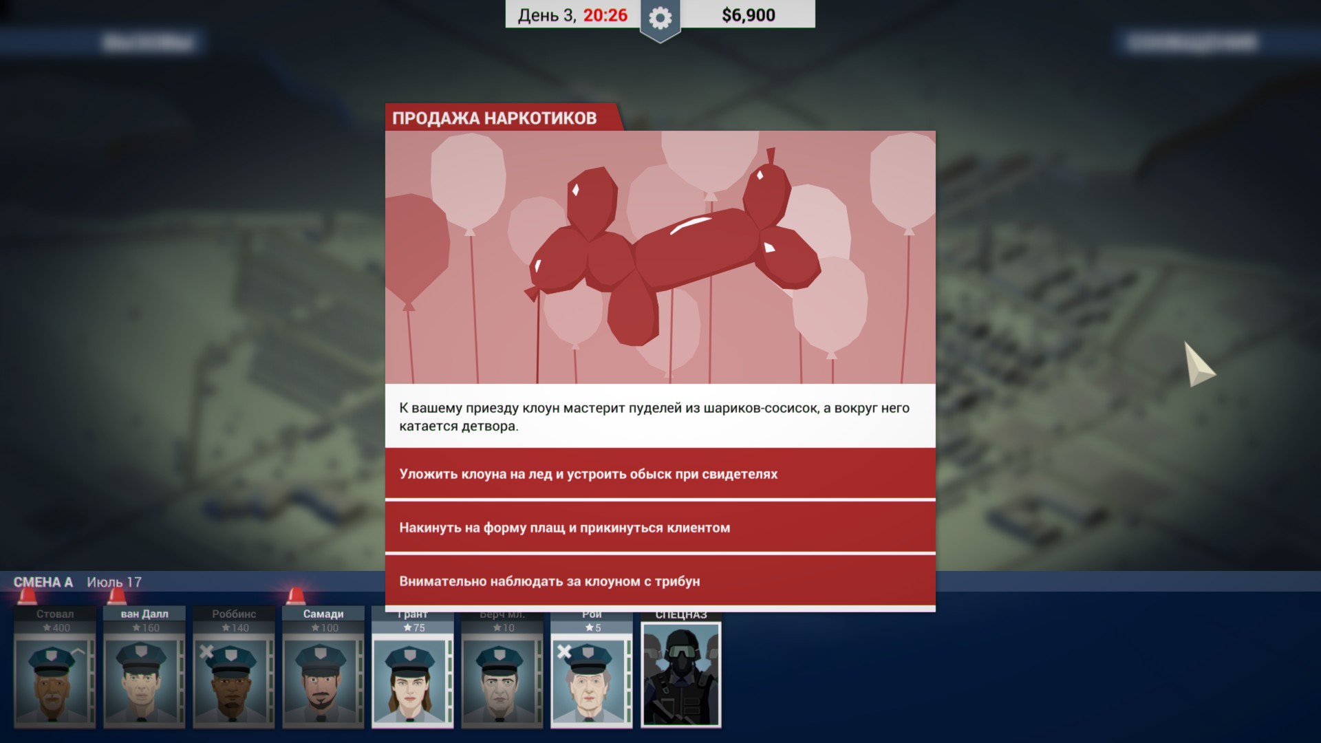 Сначала перед началом работы вы просматриваете кто сегодня на службе, сколько полицейских у вас в запасе. Всего два смены, сначала идет смена А, потом уже смена В, у каждой свой состав. Только не забывай, что полицейские тоже люди, и у них могут быть проблемы возьмут отгулы, не придут на работу, а могут и погибнуть, а ведь столько дел, а у вас ограниченны штаты приходится каждый раз думать, кого отставить на вторую смену, кого нанять, кого уволить, и причем рассчитать, а то мало ли в один день все заболеют, и кто будет спасать визжащего кассира от брутального грабителя? Тут как бы надо сделать так, нанять всех, а ненужных уволить, если бы не загвоздка: уволить просто так нельзя, можно уволить нелегально, но тогда жди проблему. Лучше легально, но для этого нужен повод: старость, опоздал, пьяный и т.д. Но есть попроще убить полицейского отправив его к кучке бандитов по одному делу, только где гарантия что он умрет, а не вернется профи. И с наймом проблемы места ограниченны же.