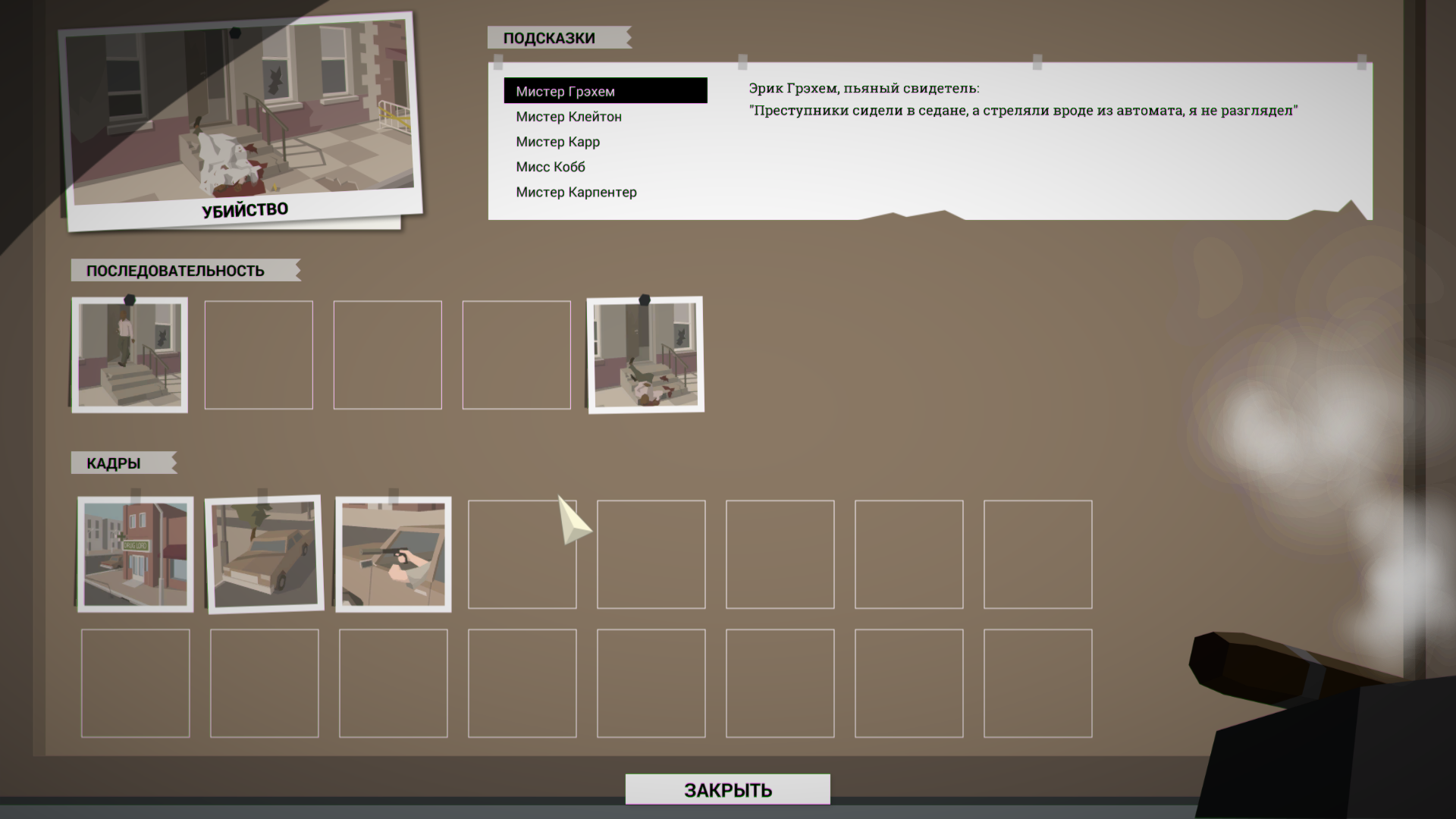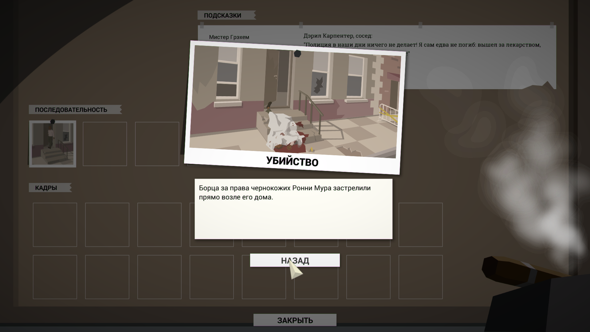Спустя время, вам уже предоставляют отсчет с кадрами и опрошенных очевидцах. И тут начинается пазл игра, вы должны по опросам очевидца расставить последовательность кадра события, для начала будет просто, но дальше уже сложнее больше кадров. После расстановки кадра детективы находят преступника, и если вы правильно расставите, то найдут правильного преступника и отправятся к его дому. И опять тут сложности, если неправильно расставишь, неправильные улики и вообще не того вы взяли, то будет суд и новые нервы.