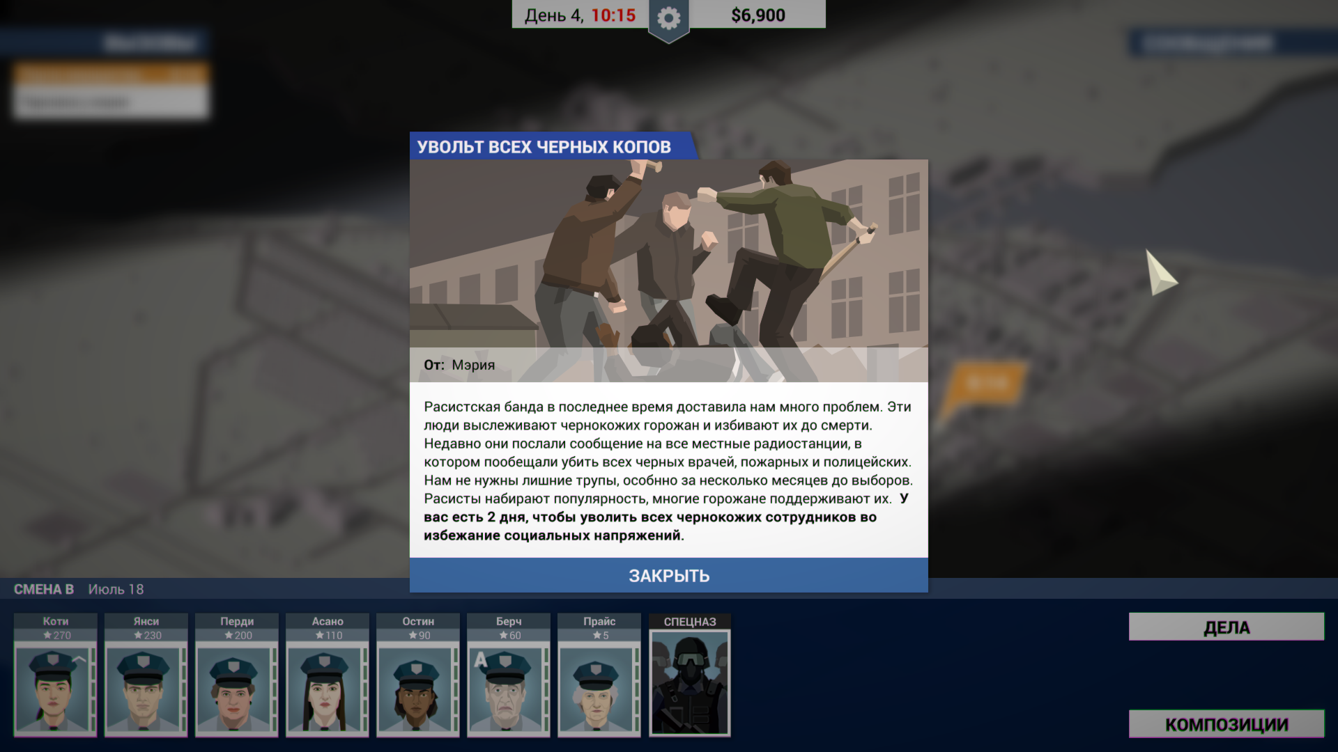 И вот закончился ужасный день, наступила ночь и все пора баиньки. И снова новый день, новая утренняя газета и опять на работу. Только вот это не все, будет также указы мэра, где понимаешь: из за расизма приказал уволить всех черных копов в течение дня. И вы можете прямо сейчас взять и уволить, повод есть ты черный, потому что так сказал мэр, только нужно оно тебе? Думаешь они, ой, ну что поделаешь и уйдут. Нет, будут последствия. Также жалко терять опытного полицейского с хорошим стажем. Вот и вам выбор ссориться с мэром или нет? Но есть третий вариант, все уложиться, не надо увольнять черных, только если оно произойдет. Только вот мэр может даст вам дополнительные слоты, прибавку, как сложно решать и искать выгоду.