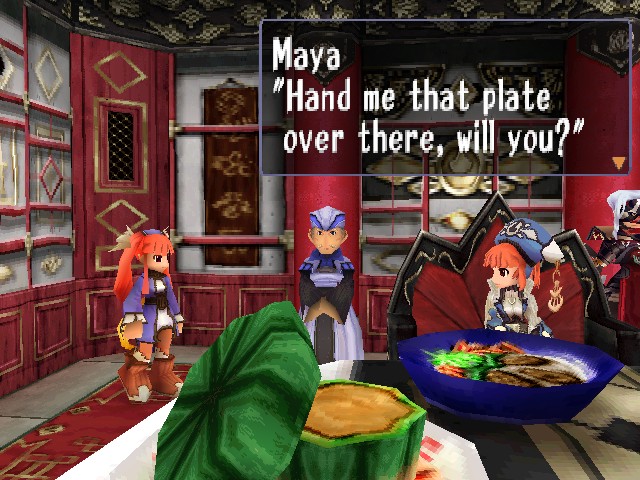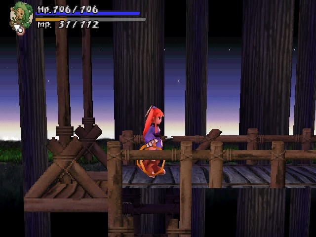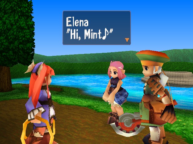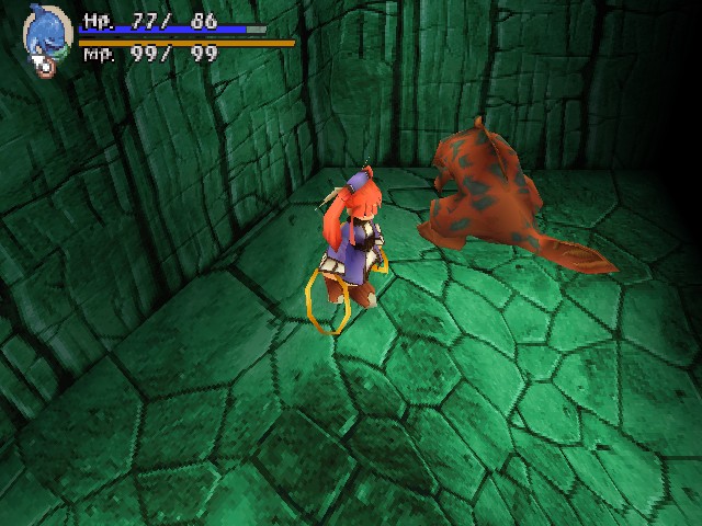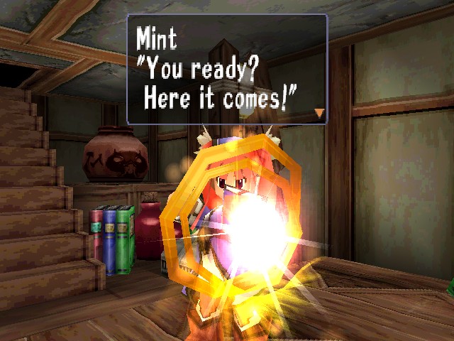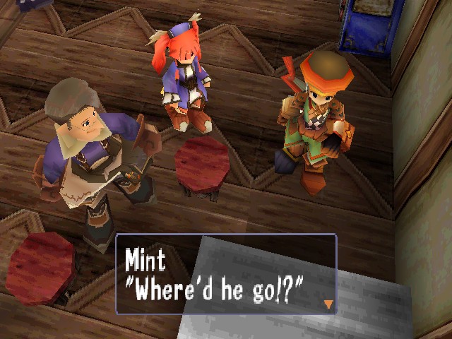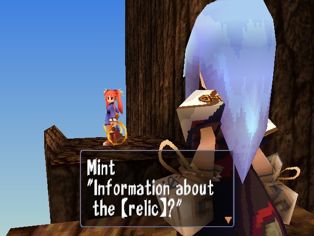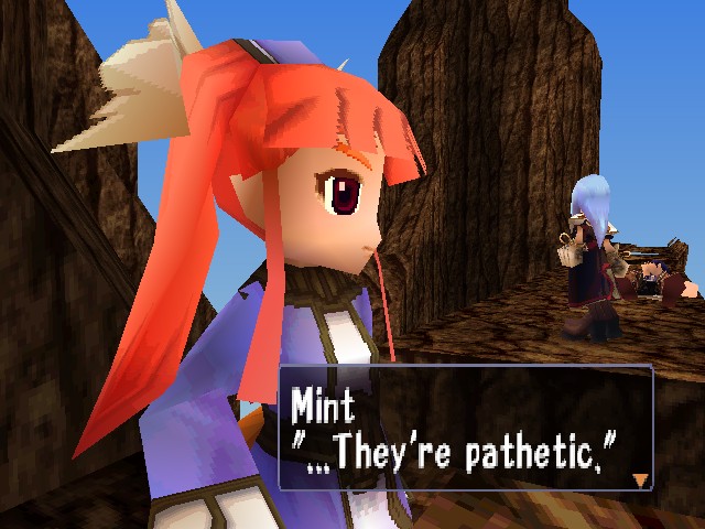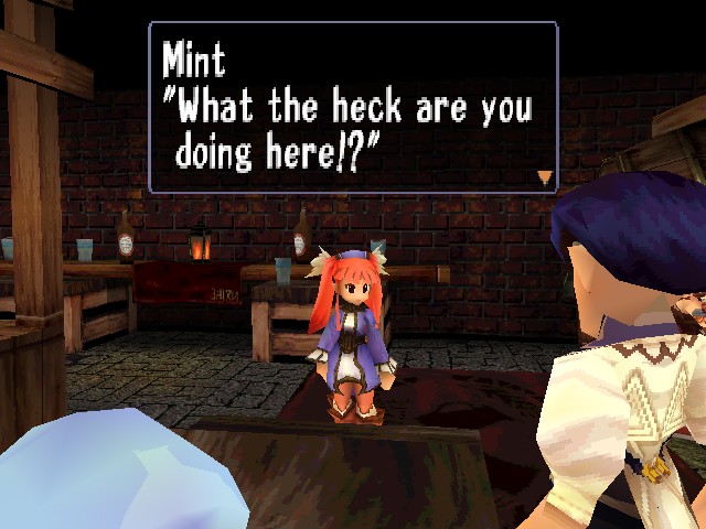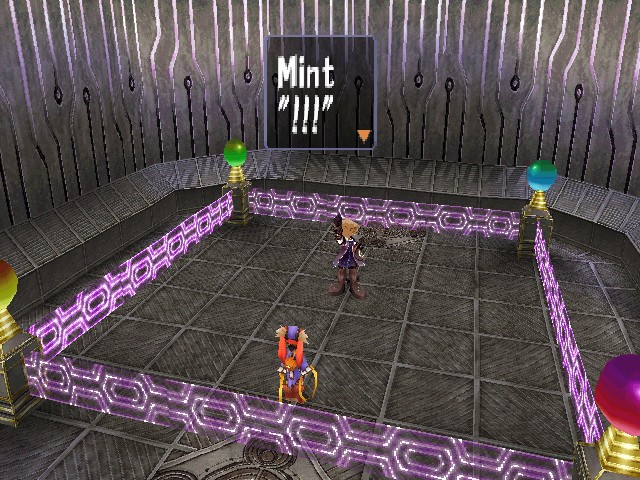 Итак начинаем игру, Минт очень голодна. Пробуем все блюда. Минт садится на кресло отца и говорит нам, что когда-то в будущем будет править всем. Но вот входит Мая (сестра Минт, принцесса). Мая отчитывает Минт, а Минт все продолжает звать Маю покушать. Смотрим сценку и узнаем, что Минт лишилась прав на трон, а будущей наследницей будет Мая. Смотрим сценку до конца. Минт бежит из дворца, решив найти Реликвию и с её помощью править всем миром! На корабле наблюдаем за разговором Смоки и Блуд, это наши будущие враги. Они собираются обокрасть Минт, но у них не получается из-за того, что корабль столкнулся с чем-то. Минт оказывается в доках, где ее встречает Девис. Смотрим сценку до конца, управление переходит к нам. Заходим в город, сохраняемся. Сохраниться можно в Inn (Гостиница), она находится там, где ходит девушка с белыми волосами. Заходите внутрь и подойдите к прилавку, выберете опцию Register. Выходим. В основном сейчас нет ничего интересного в городе. Идем в боковую часть города. Она находится в правой стороне, темный проход между 2 домами. Сразу как заходим, проверяем 2 бочки и там находим Silver Coin (они используются, чтобы оживить героев). Уходим отсюда. Бежим в противоположную такую же локацию (светлый проход). Там будет Род, с которым мы можем подраться за 100г. Но пока Рода там нет. Осмотрите землю и увидите как что-то блестит. Подходите и подберите еще один Silver Coin. Выходим. Идем к большой двери и отправляемся в Лес Карона. Бежим вперед, соблюдая инструкции. В сундуке далее лежат 3 Bronze Coins.