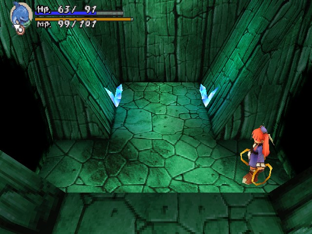 Теперь прыгаем через нижнюю стенку и так пока не дойдем до выхода. В следующей комнате надо прыгать по платформам (по очереди, справа налево). Прыгаем в дыру. Идем вправо и говорим с Рю 2 раза. Вам нужно бежать и уворачиваться от плиток. В каких сторонах по очереди падают плитки: право, лево, право, лево, с двух сторон. Как только плитки с двух сторон упали, сразу заебгаем влево.