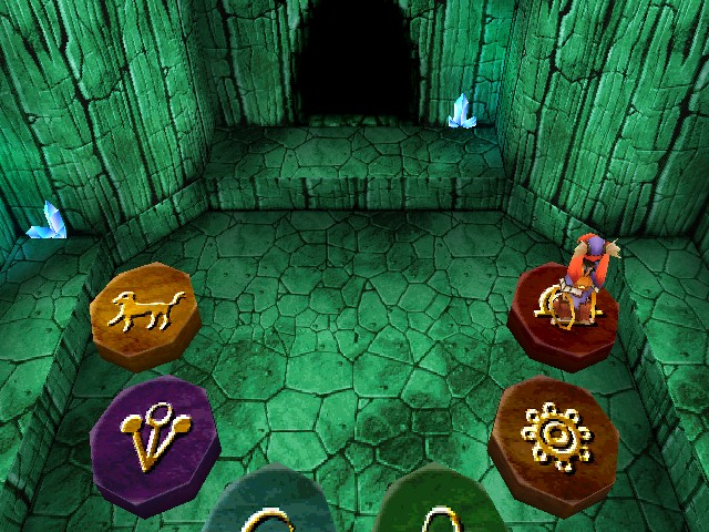 Далее наступаем на платформу. Оказываемся в треугольной комнате. Сначала идем вперед. Монетки иногда появляются в разных местах, так что проверяйте всю комнату. У лампы возьмите монетку, возьмите тиару и у подиума возьмите еще одну монетку. Выходим из этой комнаты. Идем налево и входим в комнату. У инструментов возьмите монету, также возьмите куб. Выходим из комнаты. Не наступайте на центр, либо выйдите из комнаты. Опять идем налево в последнюю комнату. Здесь восстановите здоровье, и возьмите монету. Теперь наступайте на центр, не забудьте нажать кнопку :).