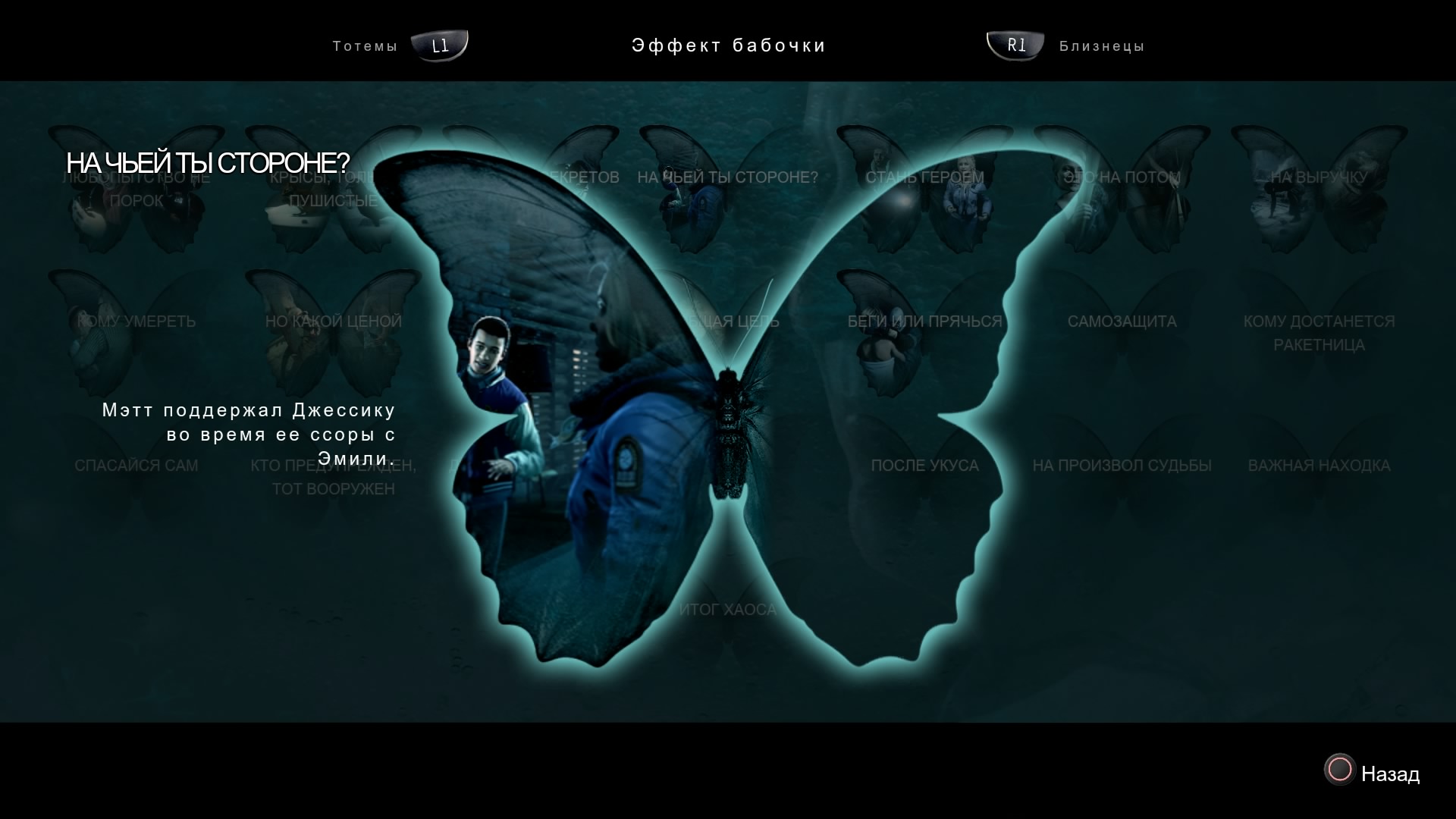 - Итак, первая фишка игры «Эффект бабочки». В Until Dawn есть особое меню бабочек, где каждая бабочка представляет собой одну из многочисленных сюжетных связок: например, связка «Майкл Джессика», связка «Саманта и бита», связка «Бросить или не бросить», связка «Майкл и животные». У каждой бабочки множество крылышек, которые меняются, в зависимости от решений игрока. Это всё наглядно показано в игре: сначала у игрока два выбора, что он сделает, каждый из этих двух выборов делится еще на два выбора, эти два выбора опять делятся еще КАЖДЫЙ на 2 выбора. И так далее. 2 4 8 16 32. Очень ветвистая структура, благодаря которой каждое прохождение игры образует уникальные сюжетные связки и отношения между персонажами. Всего этих бабочек 28 штук. В примерах выше я приводил свои примеры названий связок. А вот как бабочки-связки называются в игре: «На чьей ты стороне?», «Самозащита», «Итог Хаоса» и так далее.