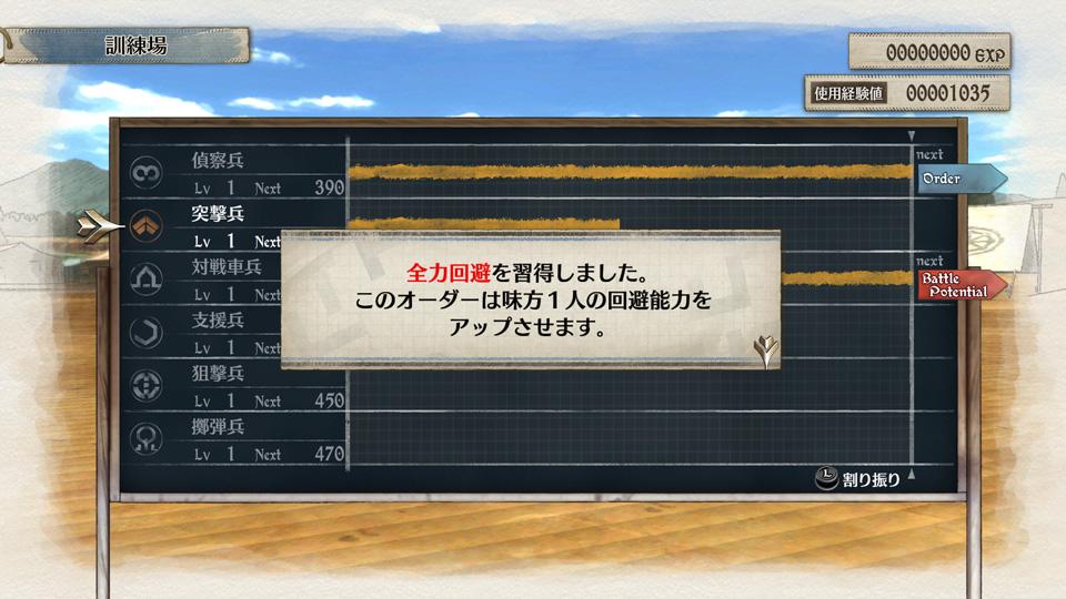 Класс повышает свой уровень, распределяя полученный опыт. Какой класс и насколько натренировать зависит от игрока. Когда класс повышает уровень, он учит новые «Приказы», а также может пробудить «Боевой потенциал».
