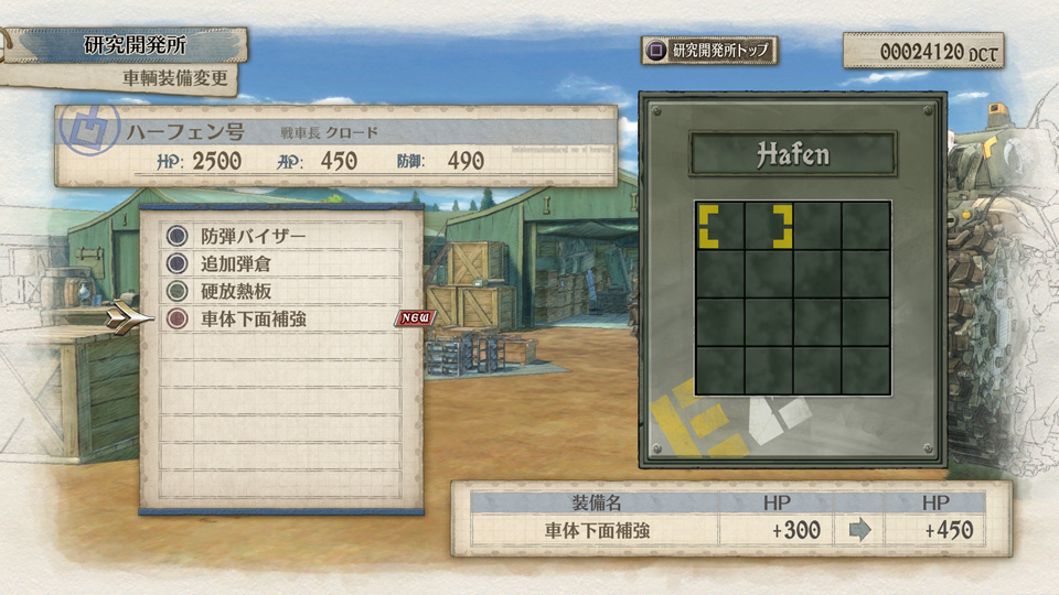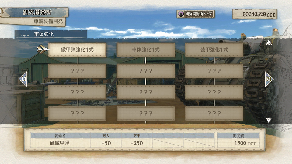 В «Отделе по разработкам для бронетехники» проводятся разработки по улучшению потенциала танка и его частей. Улучшения бронетехники в основном сводятся к улучшению орудия и брони, которые являются основой. Вы также можете разработать части для улучшения ходовой части, усиления защиты радиатора и атакующих способностей.