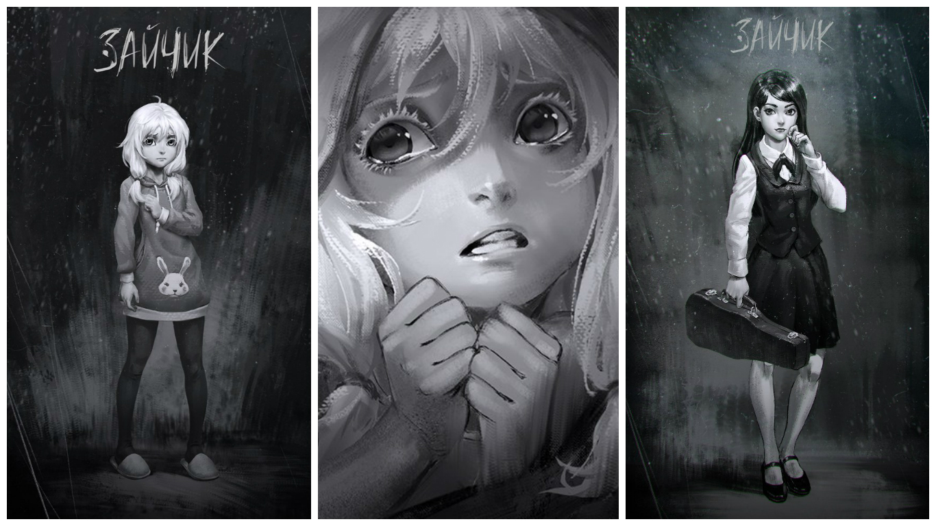 Разработка Зайчика ведётся командой, у которой даже названия нет, что не мешает проекту быть как минимум любопытным. Ведь помимо того, что это будет детективная хоррор-новелла, игра будет содержать вполне качественные иллюстрации в чёрно-белых тонах, что в русскоязычных проектах встречается очень редко (на ум приходит только Бесконечное Лето). Уровень мастерства иллюстратора можно оценить лично по приведённым ниже работам (изображены Оля и Полина, одни из действующих лиц в новелле):